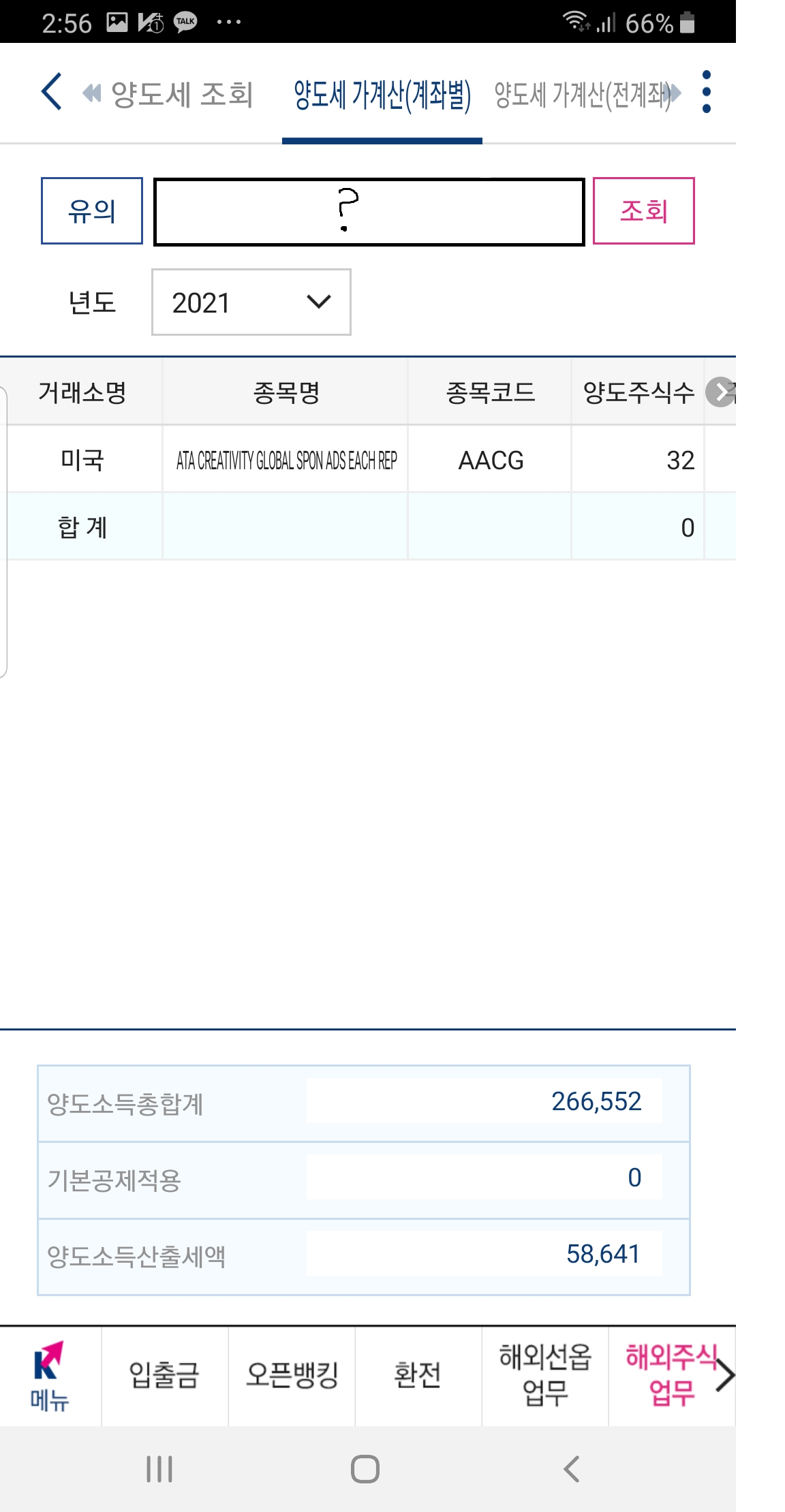 계좌는 지웠는데, 일단 내가 aacg로 수익이 266,552원 난게 보이고 세금을 낸다면 25,641이 세금인게 보인다.