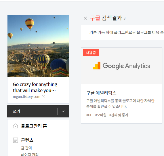 우선 티스토리의 플러그인에 보면 구글 애널리틱스 라는게 있다.