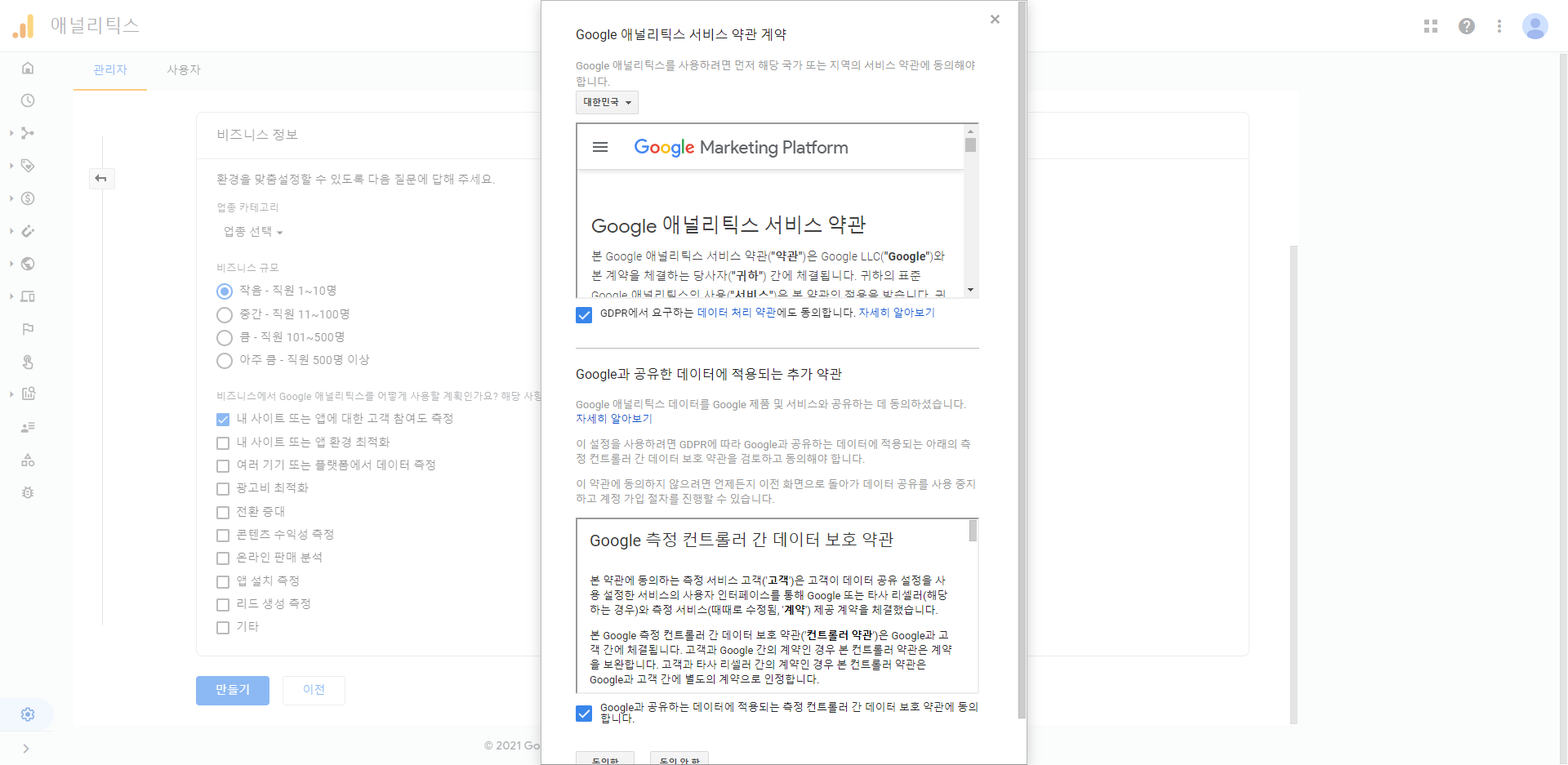 아래 체크박스 중에서 Google 제품 및 서비스에 체크해주었다.
