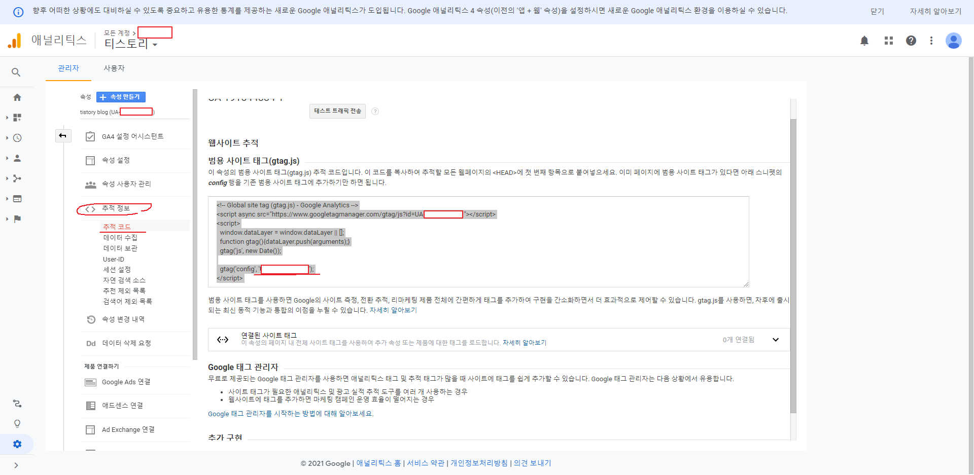 이건 구버전과 신버전이라고 간단하게 생각하면 되는데 티스토리에서는 신버전인 GA4를 지원하지 않기 때문에