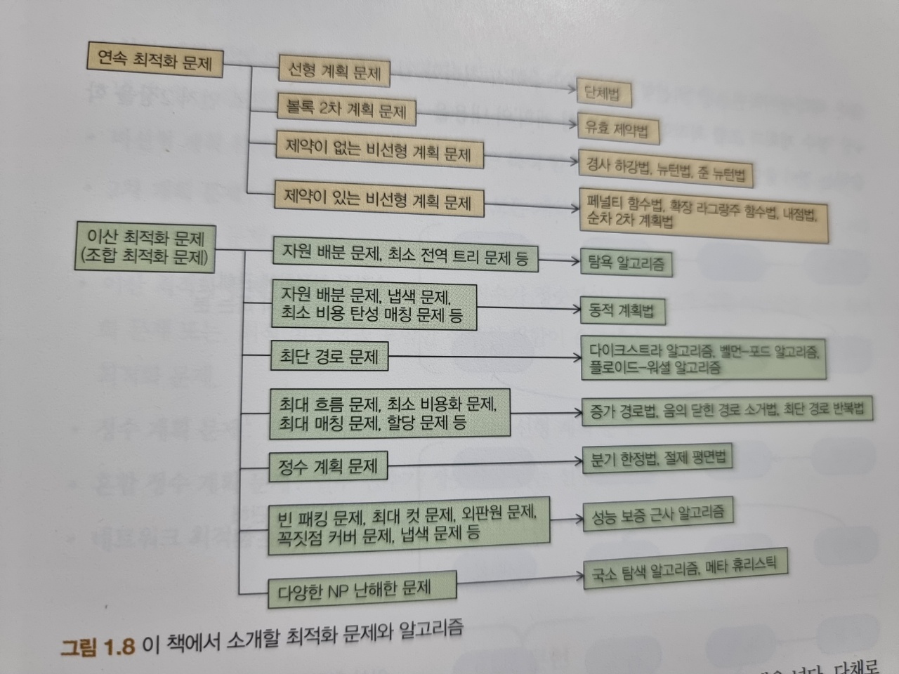 그리고 이 책에서 소개할 최적화 문제와 알고리즘을 표로 표시하여