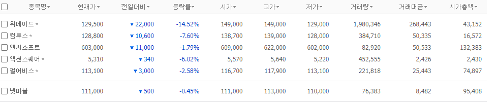 게임주들이 다같이 떡락중.