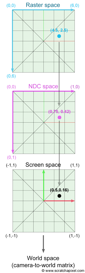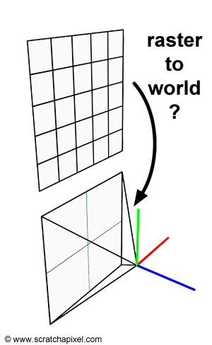 우리가 필요로 하는것은 raster space에서 이들 픽셀의 좌표와 동일한 픽셀의 좌표 사이에서 world space로