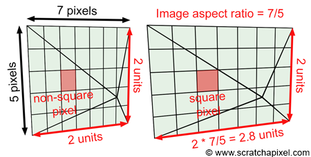 픽셀을 다시 정사각형으로 만들려면 (픽셀을 픽셀답게) 픽셀의 x좌표에 이미지 종황비(화면비율)을 곱해야 한다.