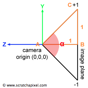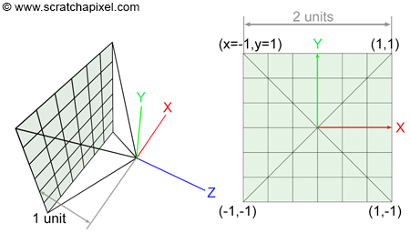 이미지 평면이 world space의 원점에서 정확히 1 단위 떨어진 곳에 위치하고(가정), 음의 z축을 따라 정렬되어 있다.