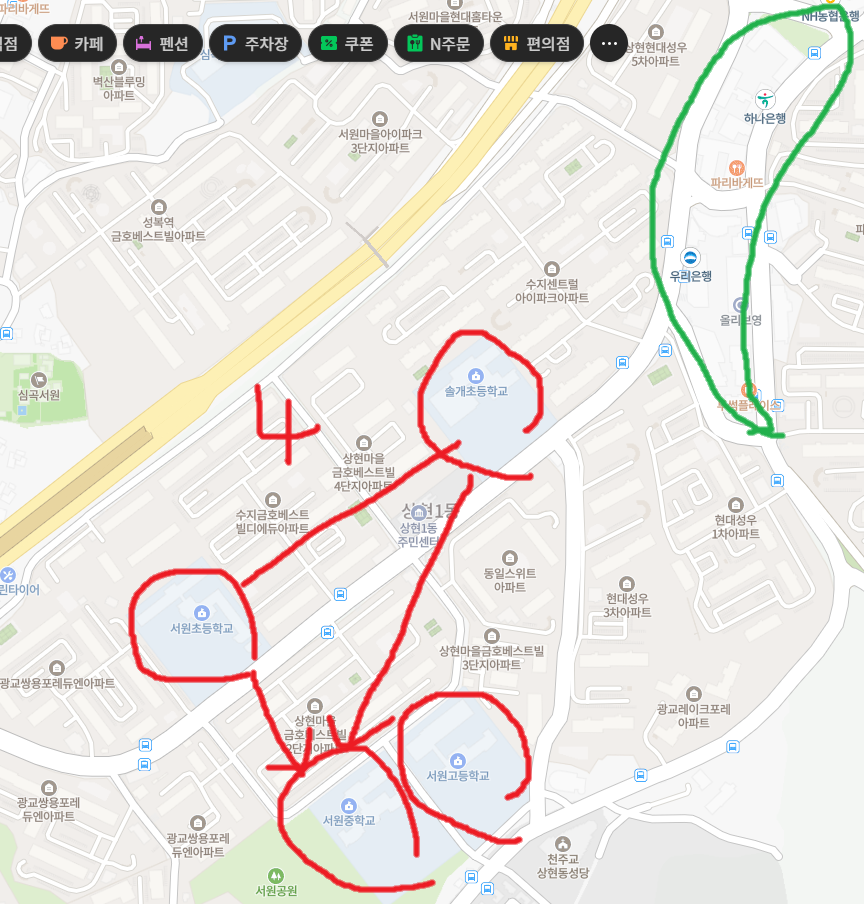 서원초는 어떻게든 가능하지만 상가나 학원가 이용이 좀 어려워서 포기.