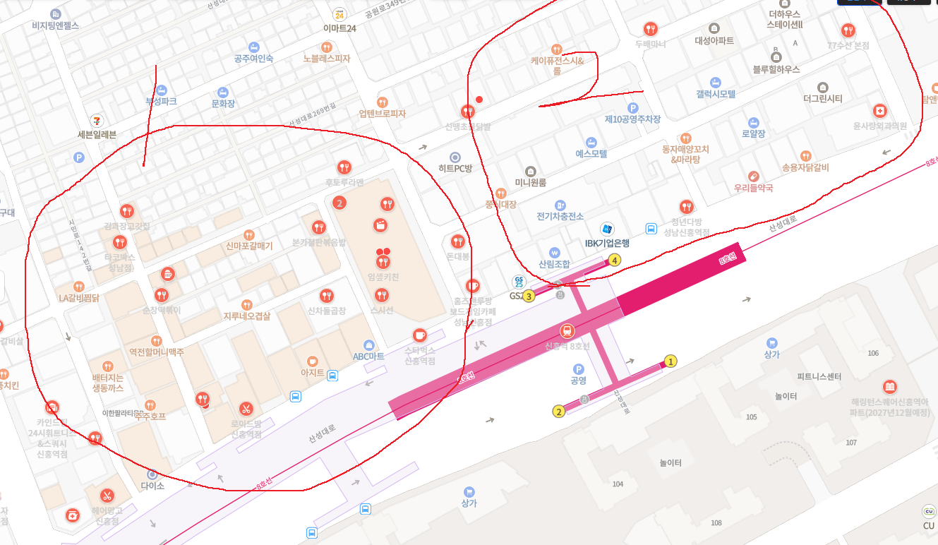 2번 지역은 거리뷰로 보면 1번과 비슷하지만 상가 + 유흥시설이 섞여있다.