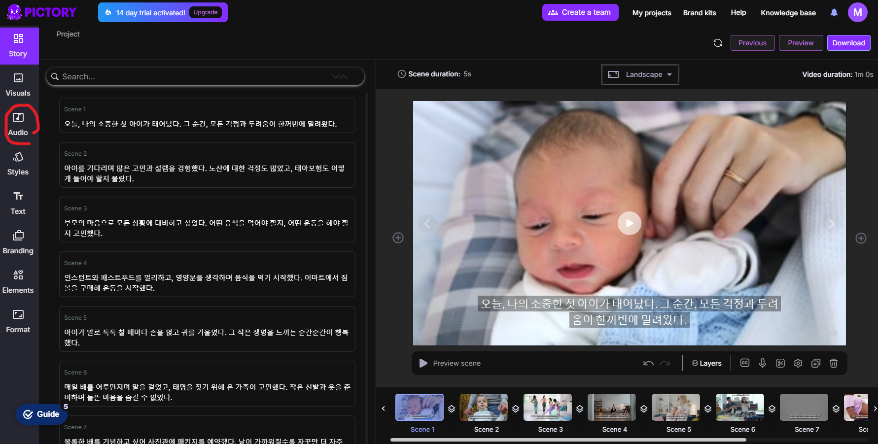 이제 이렇게 다운로드 된 걸 픽토리 AI에서 Audio에 각 신별로 오디오를 등록해 주고 모든신을 한번씩 preview 해 주고