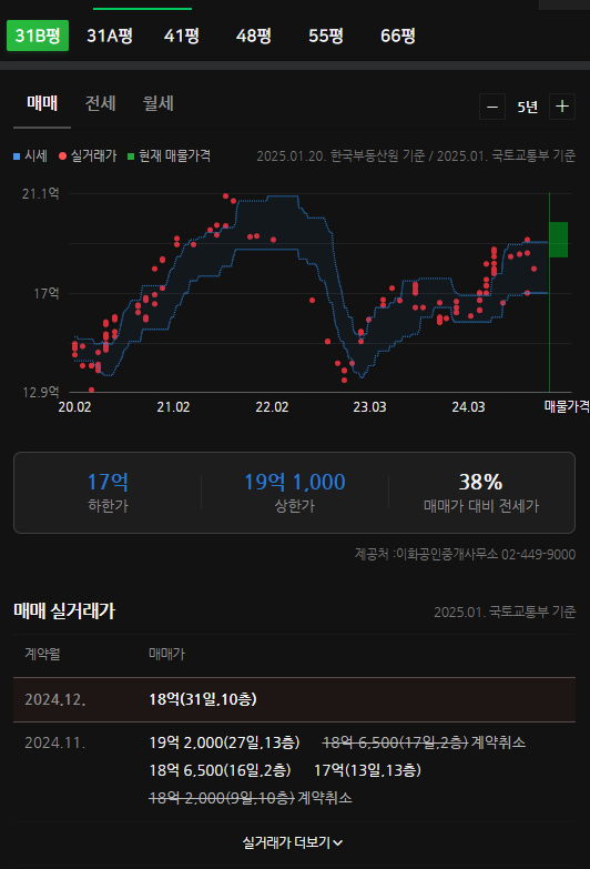 최근 거래된 시세를 살펴보면, 2025년 1월 24일 기준으로 전용면적 158㎡가 21억 원에 매매되었으며,