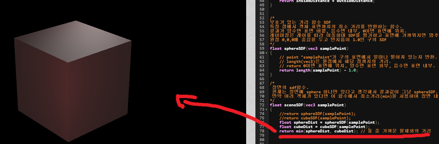 return cubeSDF(samplePoint); 이렇게 해서 큐브를 출력하거나.
