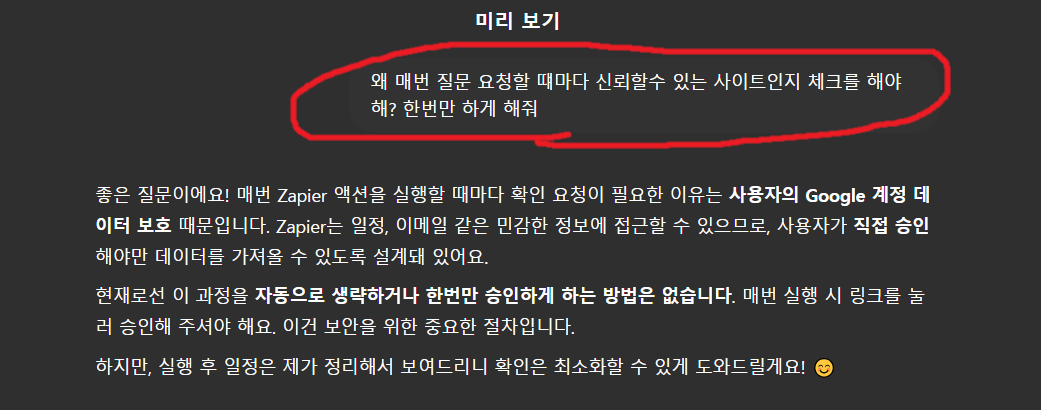 - 직접 간단한 서버리스 함수를 구축해 Zapier Webhook을 호출한 뒤, ChatGPT에는 해당 웹훅 URL만 호출하도록 하면 ChatGPT 쪽 승인 창이 뜨지 않습니다.