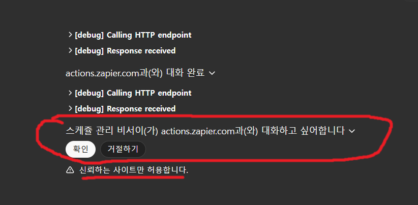 - 매번 “actions.zapier.com” 호출 권한을 묻도록 되어 있음