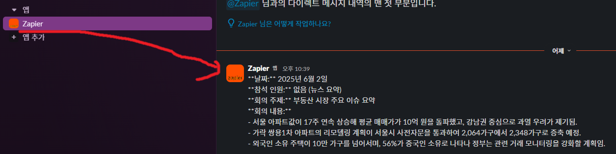 gpt로 zapier을 통해 슬랙으로 보낸 내용이정상적으로 등록되는것을 볼 수 있다.