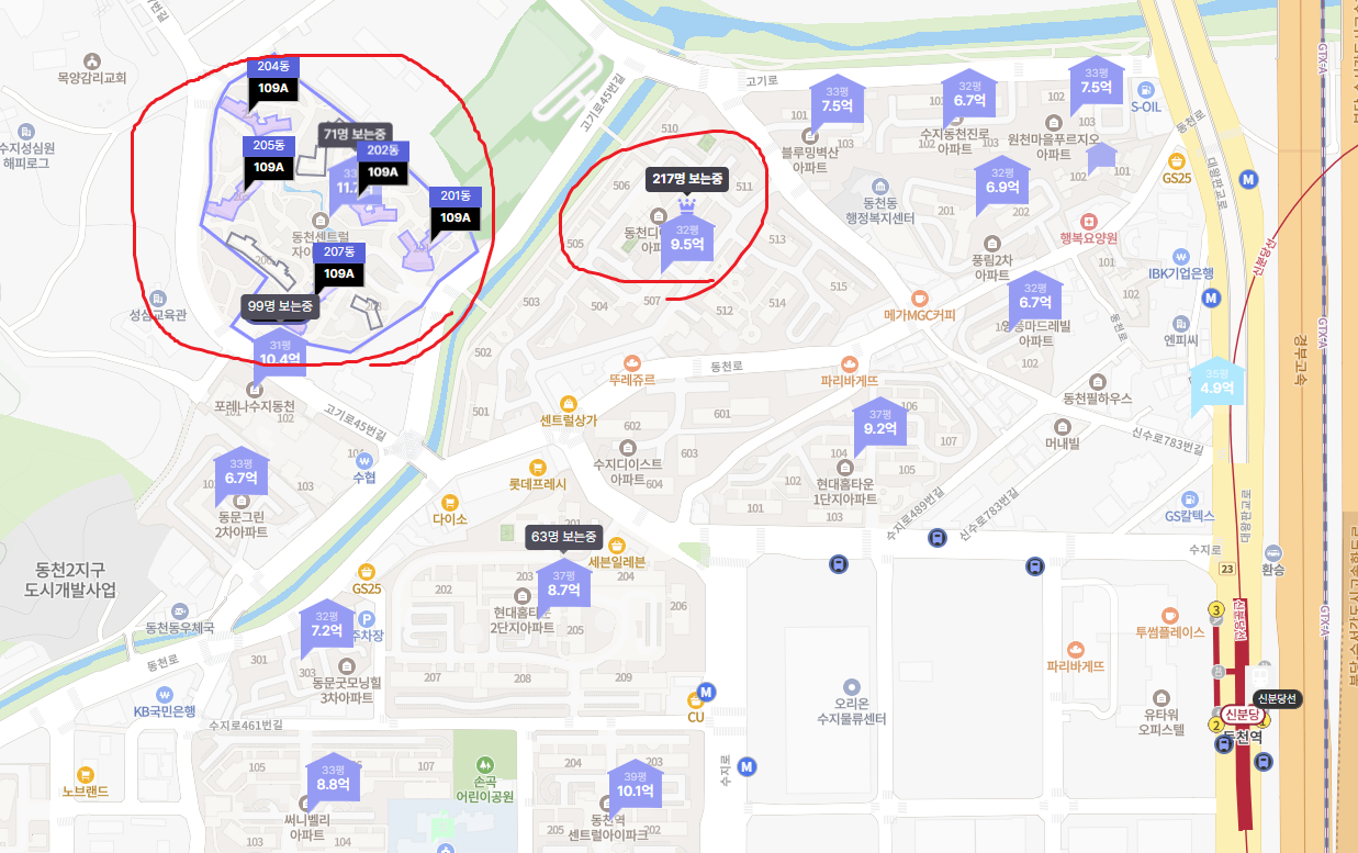 아래쪽에 있는 수지구청역과 위쪽에 있는 동천역, 딱 사이에 있다고 보면 될듯하다.