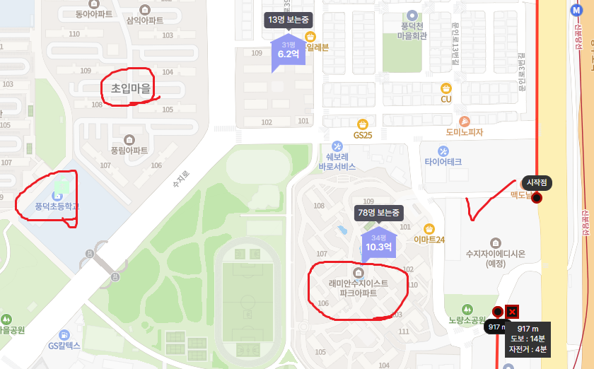둘다 아마 풍덕초로 배정을 받을 거 같은데 이렇게 되면 래미안 수지 이스트가 더 가깝다.