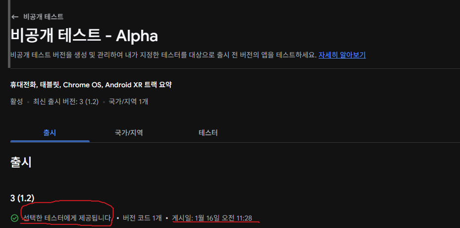 알파는 임시버전이고 실제 릴리스 버전까지 만들어야 비공개 테스터 인원에게 링크를 주면 연결해서 테스트를 할 수 있다.