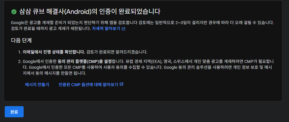저장 완료하면 인증이 완료되었다고 알려준다.