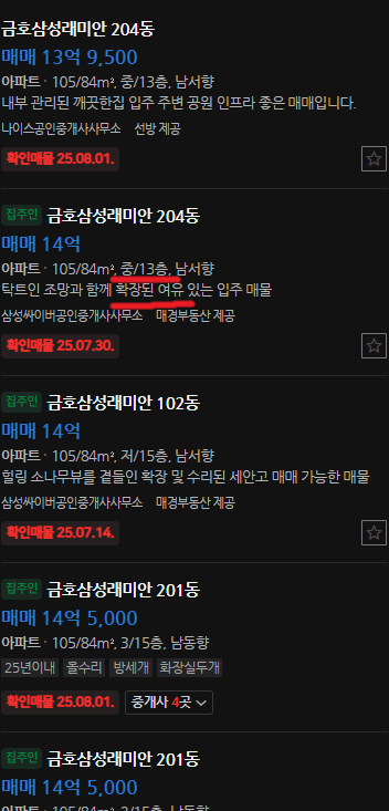 매물 가격을 보면 중층 13.95(확장여부 미기재), 14(확장됨)