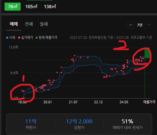 7년동안 실거래 기준 시작점과 마지막 점을 보면 6.9 -> 11.9 정도로 72프로 정도 오른 가격.