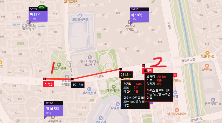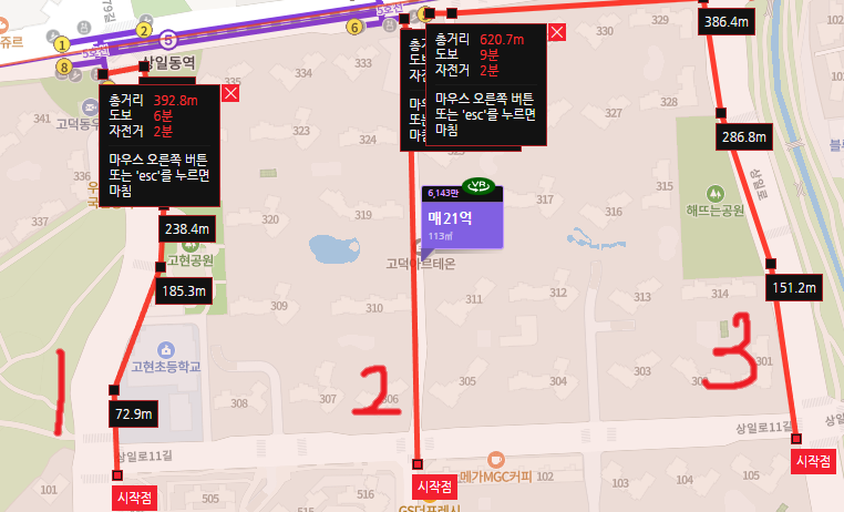 | 2 | 상일역 거리 아래 (설명 1) | (1)504동 기준 6분 (2)516동 기준 6분 | (2)101동 기준 6분 (3)105동 기준 9분 | 1번과 3번은 아르테온 외곽으로 갈 경우. 2번의 경우 아르테온 내부로 갈 경우. 다만 펜스 설치 관련 이슈가 있는데 결과에 따라 2번 보행은 어떻게 될지 모름 관련 아래 설명 2 참고 고센아 +1 |