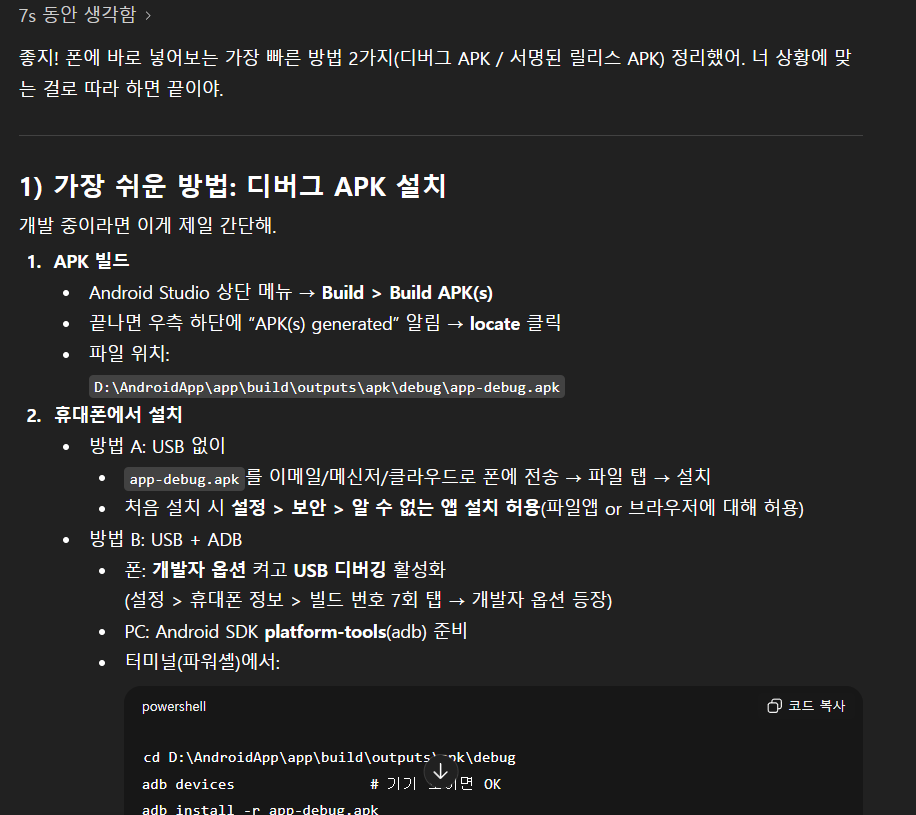 나 : 좋아 이제 작업을 마무리 하고 내 안드로이드 핸드폰에 이 앱을 넣어보고 싶어.