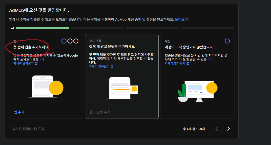 AdMob에 들어가니 "너 이미 A계정으로 연결되어 있어. 그걸 써도 돼." 라고 알려준다.